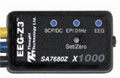 EEG-Z3 is a pre-amplified electroencephalograph sensor with built in impedance checking and 3 modes of operation: regular EEG mode (2 Hz - 1 kHz), low frequency mode (0.01 Hz - 1 kHz) for evoked potentials and low frequency applications and DC mode (0 Hz - 1 kHz) for slow cortical potentials. Modes can be changed on-the-fly. Also includes DIN input connectors for use with standard EEG electrodes